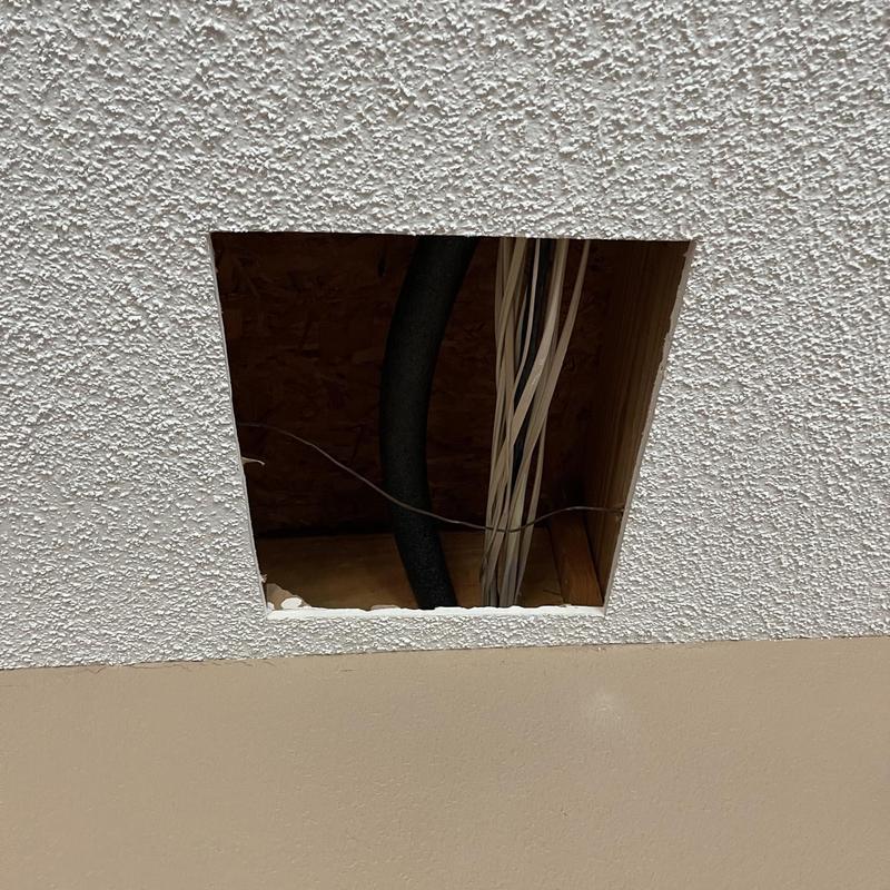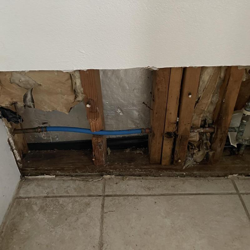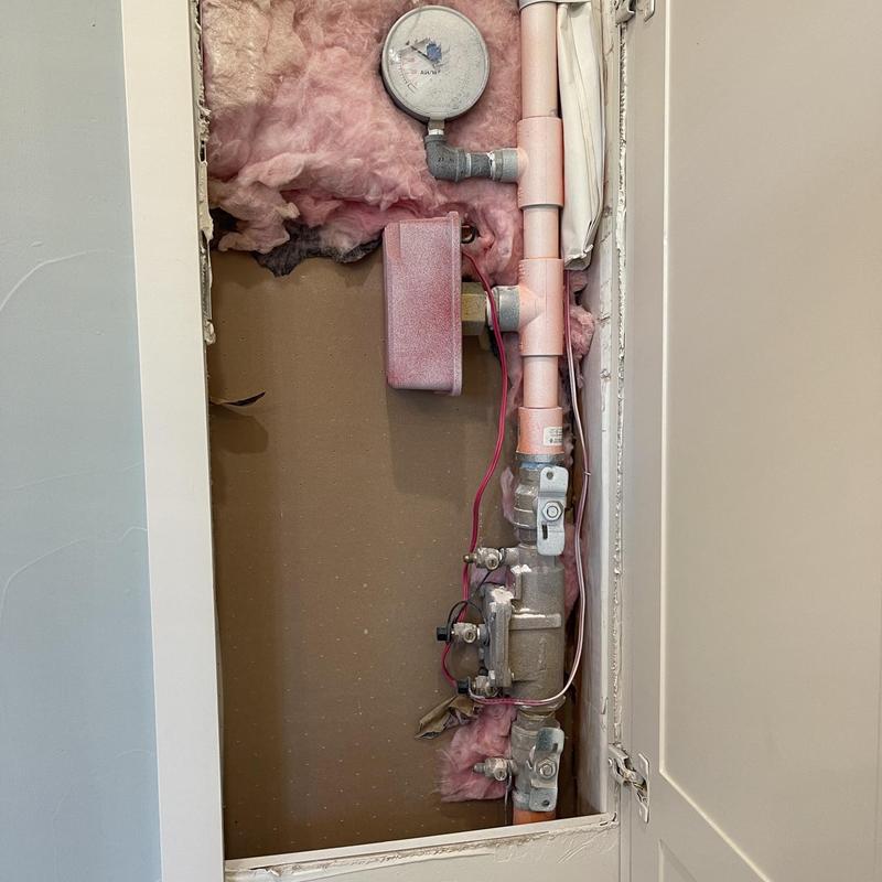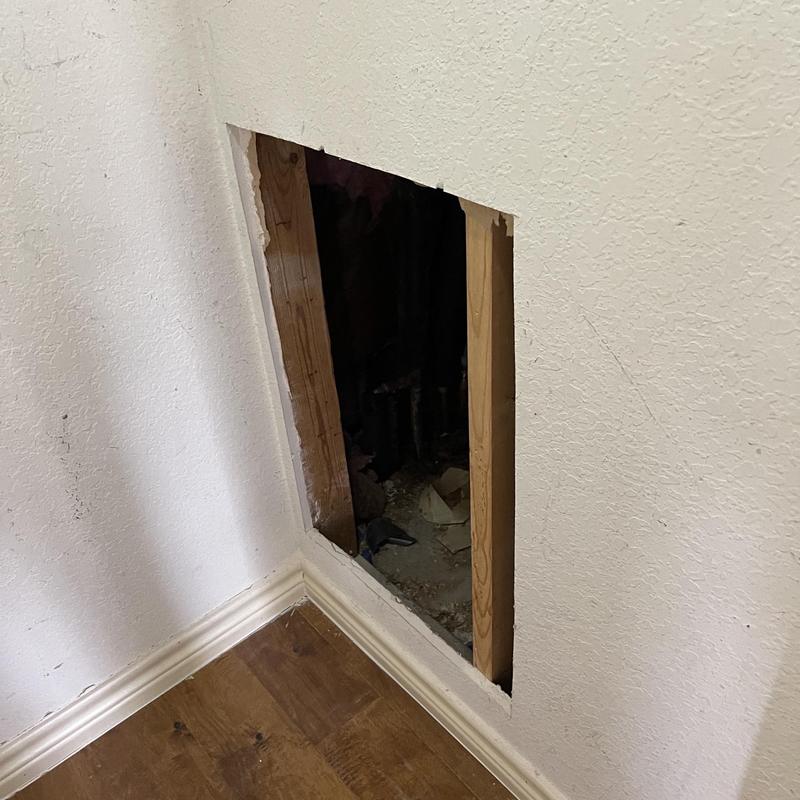 Tribeca Plumbing cut a 6-foot by 4-foot hole in sheetrock and repaired a half-inch PEX cold water line connected to a refrigerator in Dallas, Texas. The job involved restoring proper water flow by accessing and fixing the damaged pipe within the wall.
