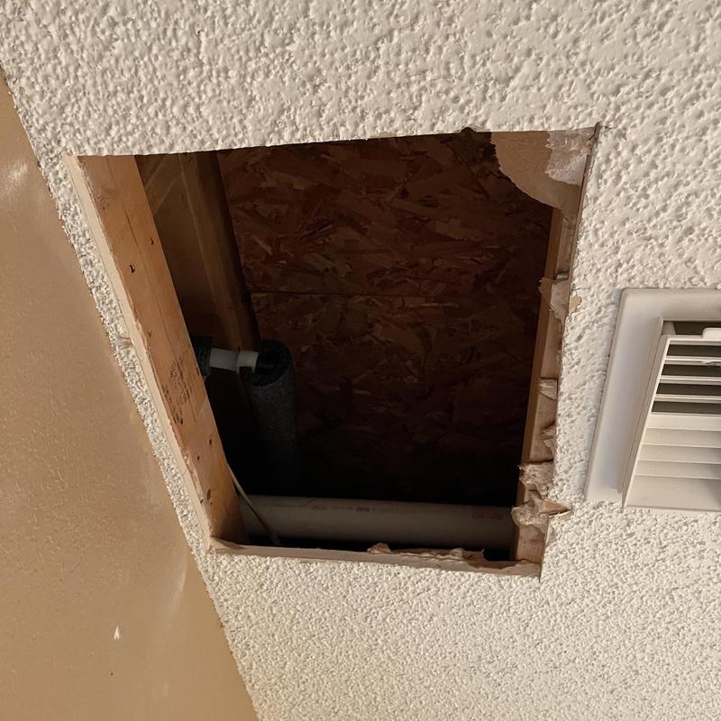 Tribeca Plumbing repaired a leak under a jacuzzi and replaced a damaged drain connection. The work took place in Dallas, Texas. Technicians identified and noted two sheetrock openings—one in the bathroom ceiling and one beneath the sink—for further repair.
