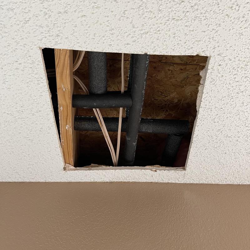 A plumber in Dallas, Texas cut into a wall to identify a burst pipe. The damaged pipe was part of the fire sprinkler supply line. The plumber advised the property owner to contact a licensed fire sprinkler contractor for specialized repairs.