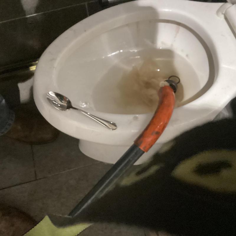 A plumber cleared a toilet clog caused by a spoon lodged in the P-trap. This service was completed in Dallas, Texas.